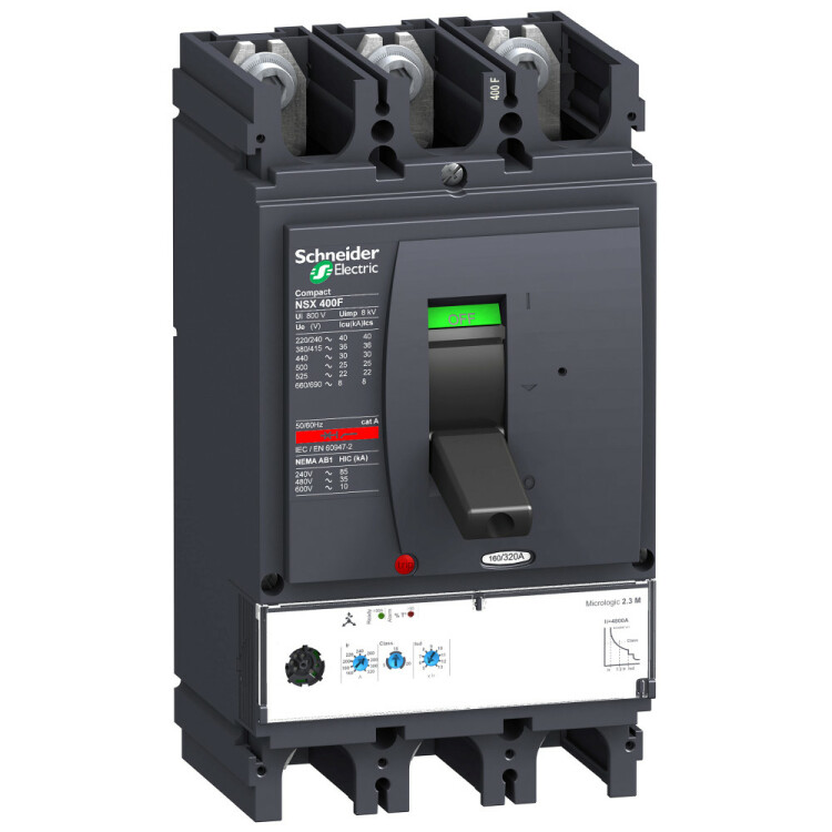 Автоматический выключатель Compact NSX400F Schneider Electric, 3P3d - номинальный ток 320 А - Icu = 36 кА 380/415 В - Ics=100% Icu - с электронным расцепителем Micrologic 2.3-M (защита электродвигателей LSOI) - ШхВхГ - 160x290x150 мм - исполнение - стационарный - монтаж - на DIN-рейке или плате. Преимущества: Прямой доступ к экономии затрат, безопасность и защита, контроль и измерение параметров электроэнергии, надежность энергоснабжения, простота и удобство. Применения: Применение в системах электроснабжения объектов любого масштаба – от крупнейших промышленных предприятий до офисных зданий для защиты распределительных сетей, генераторов, кабелей большой протяженности, электродвигателей.