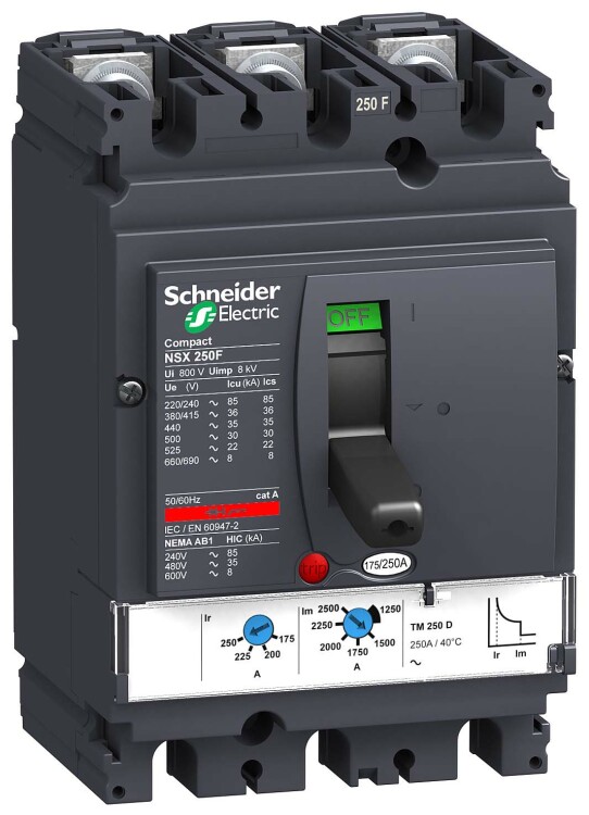 Автоматический выклю чатель Compact NSX250H Schneider Electric, исполнение – 3P3d - номинальный ток 160 А - Icu = 70 kA 380/415 В - Ics = 100% Icu - с термомагнитным расцепителем TM-D - ШхВхГ – 105x161x86 мм - исполнение – стационарный - монтаж - на плате. Преимущества: Прямой доступ к экономии затрат, безопасность и защита, контроль и измерение параметров электроэнергии, надежность энергоснабжения, простота и удобство. Применения: Применение в системах электроснабжения объектов любого масштаба – от крупнейших промышленных предприятий до офисных зданий для защиты распределительных сетей, генераторов, кабелей большой протяженности, электродвигателей.