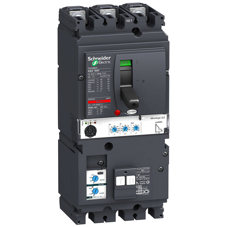 Автоматический выключатель дифференциального тока VigiCompact NSX160F Schneider Electric, 3P3d; номинальный ток 40 А; Icu = 36 кА 380/415 В; Ics=100% Icu; с электронным расцепителем Micrologic 2.2 (защита LSOI) и блоком дифференциальной защиты Vigi MH; ШхВхГ – 140x190x259 мм; исполнение – стационарный; монтаж - на DIN-рейке или плате.