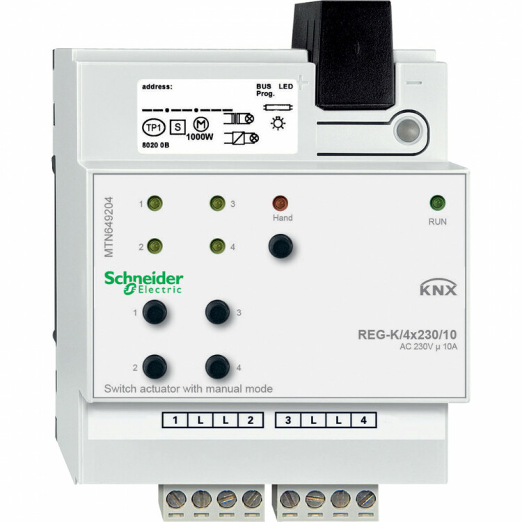 Актор для выключателя REG-K/4X230/10 с ручным управлением. серия продукта: KNX - тип устройства или его аксессуаров: исполнительный элемент выключателя - тип шины: KNX - доп. информация о модульном устройстве: подключается к разным фазам. Преимущества: KNX от Schneider Electric предлагает единую комплексную систему, отвечающую международным стандартам, и множество решений, охватывающих различные технические сферы, при этом обеспечивая гибкость, комфортабельность, безопасность и рентабельность, особенно в новых зданиях. Идея системы KNX проста и оригинальна одновременно. KNX совмещает все основные функции здания, такие как освещение, отопление, кондиционирование воздуха или затенение в одну интеллектуальную систему, что помогает снизить эксплуатационные расходы благодаря значительной экономии электроэнергии, сократить время на установку, а также увеличить гибкость и адаптируемость к будущим доработкам.... применения: Решения KNX от Schneider Electric предназначены для, Офисных зданий, Общественных зданий, Отелей, Школ, Больниц, Магазинов, Элитных жилых помещений. Система интеллектуального управления зданием KNX – одно из наиболее эффективных решений для снижения энергопотребления и рационального использования энергии. Особенно хорошо KNX проявляет свой потенциал в офисных зданиях.. Программное обеспечение SeeTool от Schneider Electric отмечает пункты потенциальной экономии и представляет решения для управления зданием с помощью KNX по принципу «от комнаты к комнате», что позволяет в полной мере использовать имеющийся потенциал системы KNX....