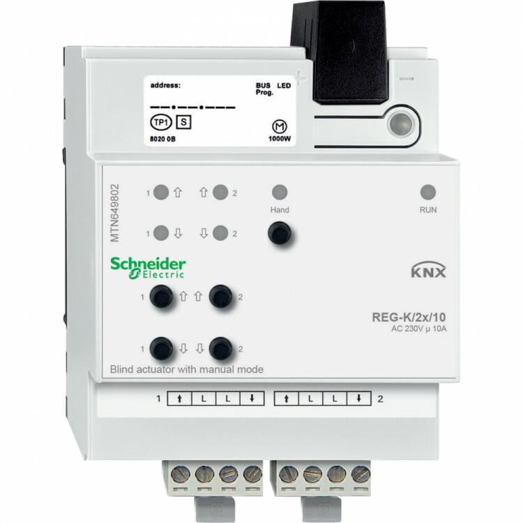 Актор для жал/выключателя REG-K/2X/10 ручное управление. серия продукта: KNX - тип устройства или его аксессуаров: привод рольставни - режим работы: ручной, Система шины KNX - тип шины: KNX. Преимущества: KNX от Schneider Electric предлагает единую комплексную систему, отвечающую международным стандартам, и множество решений, охватывающих различные технические сферы, при этом обеспечивая гибкость, комфортабельность, безопасность и рентабельность, особенно в новых зданиях. Идея системы KNX проста и оригинальна одновременно. KNX совмещает все основные функции здания, такие как освещение, отопление, кондиционирование воздуха или затенение в одну интеллектуальную систему, что помогает снизить эксплуатационные расходы благодаря значительной экономии электроэнергии, сократить время на установку, а также увеличить гибкость и адаптируемость к будущим доработкам.... применения: Решения KNX от Schneider Electric предназначены для, Офисных зданий, Общественных зданий, Отелей, Школ, Больниц, Магазинов, Элитных жилых помещений. Система интеллектуального управления зданием KNX – одно из наиболее эффективных решений для снижения энергопотребления и рационального использования энергии. Особенно хорошо KNX проявляет свой потенциал в офисных зданиях.. Программное обеспечение SeeTool от Schneider Electric отмечает пункты потенциальной экономии и представляет решения для управления зданием с помощью KNX по принципу «от комнаты к комнате», что позволяет в полной мере использовать имеющийся потенциал системы KNX....