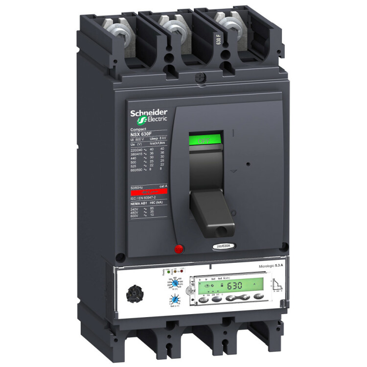 Автоматический выключатель Compact NSX630F Schneider Electric, 3P3d - номинальный ток 630 А - Icu = 70 кА 380/415 В - Ics=100% Icu - с электронным расцепителем Micrologic 5.3 A (защита LSI амперметр) - ШхВхГ - 140x225x110 мм - исполнение - стационарный - монтаж - на DIN-рейке или плате. Преимущества: Прямой доступ к экономии затрат, безопасность и защита, контроль и измерение параметров электроэнергии, надежность энергоснабжения, простота и удобство. Применения: Применение в системах электроснабжения объектов любого масштаба – от крупнейших промышленных предприятий до офисных зданий для защиты распределительных сетей, генераторов, кабелей большой протяженности, электродвигателей.