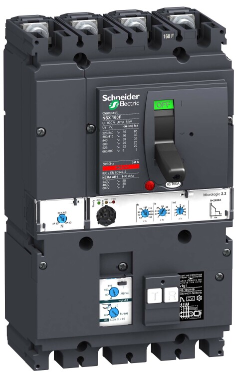 Автоматический выключатель дифференциального тока VigiCompact NSX160F Schneider Electric, 4P4d - номинальный ток 100 А - Icu = 36 кА 380/415 В - Ics=100% Icu - с электронным расцепителем Micrologic 2.2 (защита LSOI) и блоком дифференциальной защиты Vigi MH - ШхВхГ – 145x190x292 мм - исполнение – стационарный - монтаж - на DIN-рейке или плате. Преимущества: Прямой доступ к экономии затрат, безопасность и защита, контроль и измерение параметров электроэнергии, надежность энергоснабжения, простота и удобство. Применения: Применение в системах электроснабжения объектов любого масштаба – от крупнейших промышленных предприятий до офисных зданий для защиты распределительных сетей, генераторов, кабелей большой протяженности, электродвигателей.