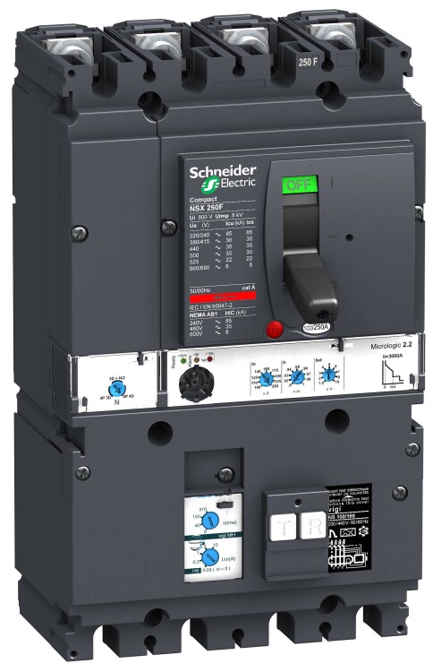 Автоматический выключатель дифференциального тока VigiCompact NSX250F Schneider Electric, 4P4d; номинальный ток 100 А; Icu = 36 кА 380/415 В; Ics=100% Icu; с электронным расцепителем Micrologic 2.2 (защита LSOI) и блоком дифференциальной защиты Vigi MH; ШхВхГ – 145x190x292 мм; исполнение – стационарный; монтаж - на DIN-рейке или плате.