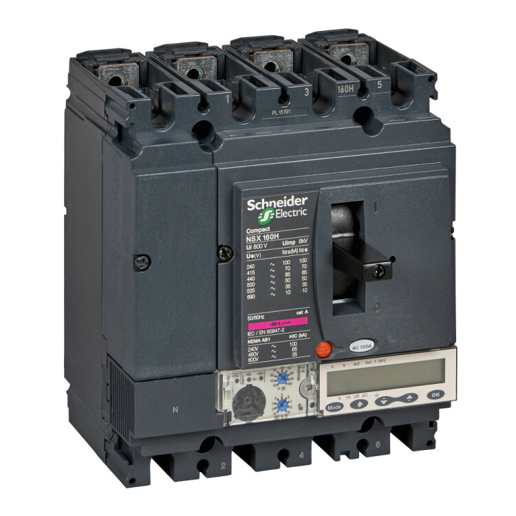 Автоматический выключатель ComPact NSX160H, исполнение – 4P 3d, 4d, 3d + N/2, OSN; номинальный ток 160 А; Icu = 70 kA 380/415 В; Ics = 100% Icu; с электронным расцепителем Micrologic 5.2 A (защита LSI, амперметр); ШхВхГ – 140x161x86 мм; исполнение – стационарный; монтаж - на плате.