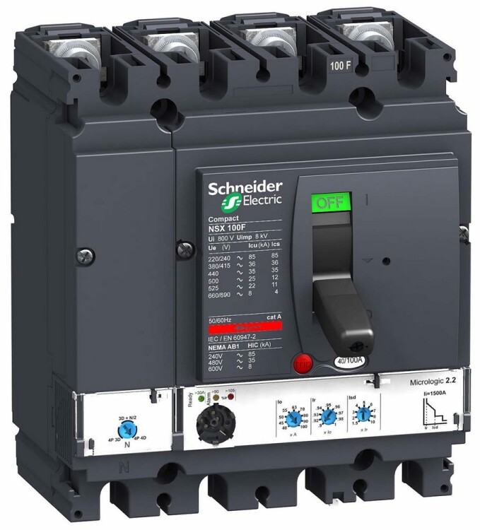Автоматический выключатель Compact NSX100B, исполнение – 4P 3d, 4d, 3d + N/2 - номинальный ток 40 А - Icu = 25 kA 380/415 В - Ics = 100% Icu - с электронным расцепителем Micrologic 2.2 (защита LSOI) - ШхВхГ – 140x161x86 мм - исполнение – стационарный - монтаж - на плате. Преимущества: Прямой доступ к экономии затрат, безопасность и защита, контроль и измерение параметров электроэнергии, надежность энергоснабжения, простота и удобство. Применения: Применение в системах электроснабжения объектов любого масштаба – от крупнейших промышленных предприятий до офисных зданий для защиты распределительных сетей, генераторов, кабелей большой протяженности, электродвигателей.