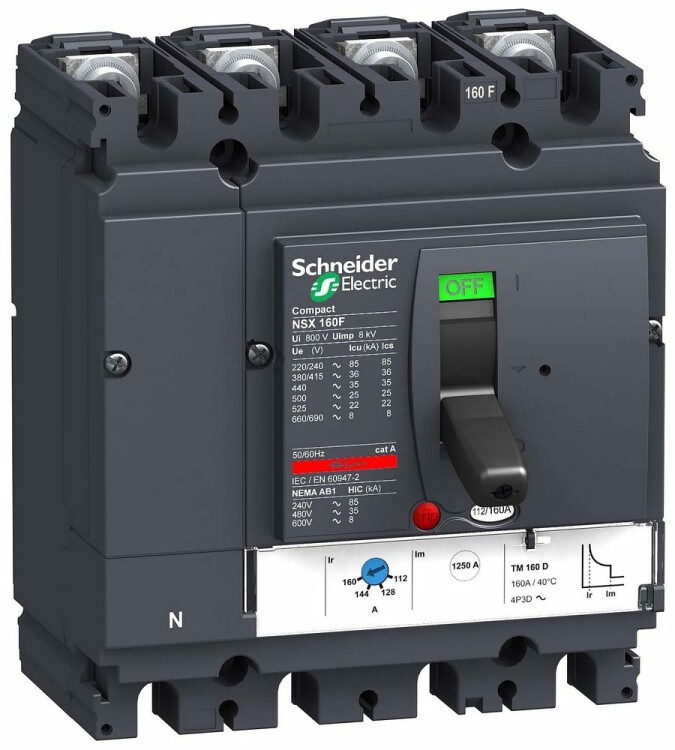 Автоматический выклю чатель Compact NSX160B, исполнение – 4P4d - номинальный ток 125 А - Icu = 25 kA 380/415 В - Ics = 100% Icu - с термомагнитным расцепителем TM-D - ШхВхГ – 140x161x86 мм - исполнение – стационарный - монтаж - на плате. Преимущества: Прямой доступ к экономии затрат, безопасность и защита, контроль и измерение параметров электроэнергии, надежность энергоснабжения, простота и удобство. Применения: Применение в системах электроснабжения объектов любого масштаба – от крупнейших промышленных предприятий до офисных зданий для защиты распределительных сетей, генераторов, кабелей большой протяженности, электродвигателей.