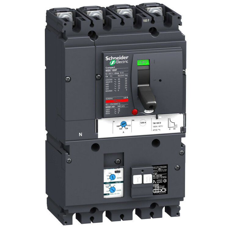 Автоматический выключатель дифференциального тока VigiCompact NSX160F Schneider Electric, 4P4d; номинальный ток 125 А; Icu = 36 кА 380/415 В; Ics=100% Icu; с термомагнитным расцепителем TM-D и блоком дифференциальной защиты Vigi MH; ШхВхГ – 145x190x292 мм; исполнение – стационарный; монтаж - на DIN-рейке или плате.