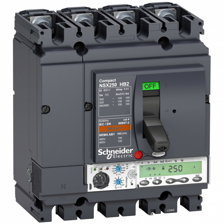 Автоматический выключатель Compact NSX100HB2, исполнение – 4P 3d, 4d, 3d + N/2, OSN - номинальный ток 40 А - Icu = 100 kA при 690 В - Ics = 100% Icu - с электронным расцепителем Micrologic 6.2 E (защита LSIG, счетчик энергии) - ШхВхГ – 141x192x135 мм - исполнение – стационарный - монтаж - на плате. Преимущества: Прямой доступ к экономии затрат, безопасность и защита, контроль и измерение параметров электроэнергии, надежность энергоснабжения, простота и удобство. Применения: Применение в системах электроснабжения объектов любого масштаба – от крупнейших промышленных предприятий до офисных зданий для защиты распределительных сетей, генераторов, кабелей большой протяженности, электродвигателей.