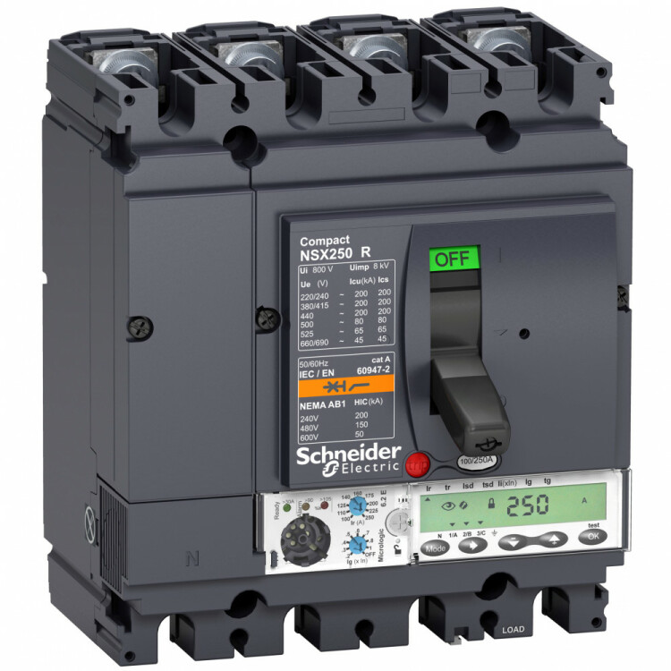 Автоматический выключатель Compact NSX100R, исполнение – 4P 3d, 4d, 3d + N/2, OSN - номинальный ток 40 А - Icu = 200 kA 380/415 В - Ics = 100% Icu - с электронным расцепителем Micrologic 6.2 E (защита LSIG, счётчик энергии) - ШхВхГ – 141x192x135 мм - исполнение – стационарный - монтаж - на плате. Преимущества: Прямой доступ к экономии затрат, безопасность и защита, контроль и измерение параметров электроэнергии, надежность энергоснабжения, простота и удобство. Применения: Применение в системах электроснабжения объектов любого масштаба – от крупнейших промышленных предприятий до офисных зданий для защиты распределительных сетей, генераторов, кабелей большой протяженности, электродвигателей.