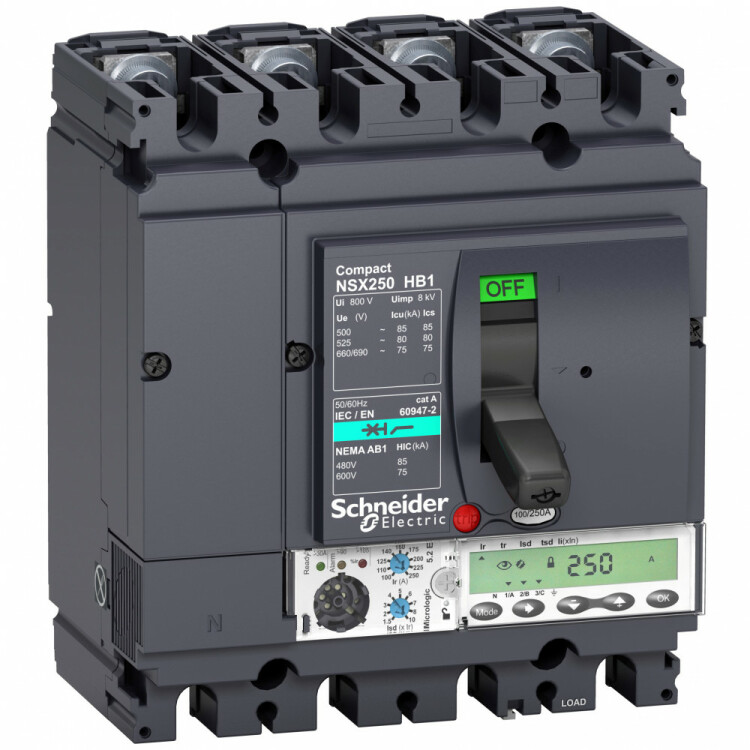 Автоматический выключатель Compact NSX100HB1, исполнение – 4P 3d, 4d, 3d + N/2,OSN - номинальный ток 40 А - Icu = 75 kA при 690 В - Ics = 100% Icu - с электронным расцепителем Micrologic 5.2 E (защита LSI, счётчик энергии) - ШхВхГ – 141x192x135 мм - исполнение – стационарный - монтаж - на плате. Преимущества: Прямой доступ к экономии затрат, безопасность и защита, контроль и измерение параметров электроэнергии, надежность энергоснабжения, простота и удобство. Применения: Применение в системах электроснабжения объектов любого масштаба – от крупнейших промышленных предприятий до офисных зданий для защиты распределительных сетей, генераторов, кабелей большой протяженности, электродвигателей.
