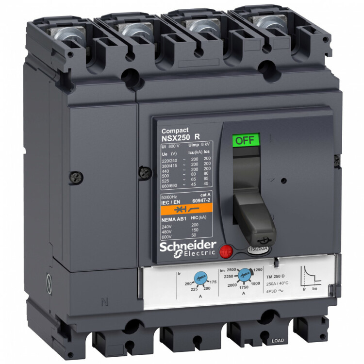 Автоматический выклю чатель Compact NSX250R Schneider Electric, исполнение – 4P4d - номинальный ток 200 А - Icu = 200 kA при 415 В - Ics = 100% Icu - с термомагнитным расцепителем TM-D - ШхВхГ – 141x192x135 мм - исполнение – стационарный - монтаж - на плате. Преимущества: Прямой доступ к экономии затрат, безопасность и защита, контроль и измерение параметров электроэнергии, надежность энергоснабжения, простота и удобство. Применения: Применение в системах электроснабжения объектов любого масштаба – от крупнейших промышленных предприятий до офисных зданий для защиты распределительных сетей, генераторов, кабелей большой протяженности, электродвигателей.