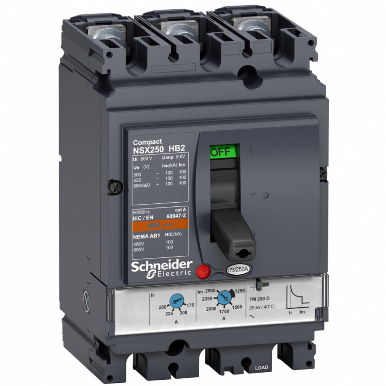 Автоматический выклю чатель Compact NSX250HB2 Schneider Electric, исполнение – 3P3d - номинальный ток 200 А - Icu = 100 kA при 690 В - Ics = 100% Icu - с термомагнитным расцепителем TM-D - ШхВхГ – 108x192x135 мм - исполнение – стационарный - монтаж - на плате. Преимущества: Прямой доступ к экономии затрат, безопасность и защита, контроль и измерение параметров электроэнергии, надежность энергоснабжения, простота и удобство. Применения: Применение в системах электроснабжения объектов любого масштаба – от крупнейших промышленных предприятий до офисных зданий для защиты распределительных сетей, генераторов, кабелей большой протяженности, электродвигателей.