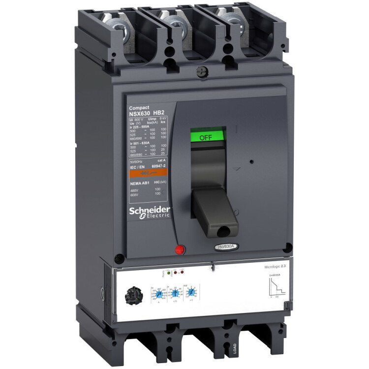 Автоматический выклю чатель Compact NSX400HB2 Schneider Electric, 3P3d - номинальный ток 250 А - Icu = 100 кА 690 В - Ics=100% Icu - с электронным расцепителем Micrologic 2.3 (защита LSOI) - ШхВхГ – 152x292x152 мм - исполнение – стационарный - монтаж - на DIN-рейке или плате. Преимущества: Прямой доступ к экономии затрат, безопасность и защита, контроль и измерение параметров электроэнергии, надежность энергоснабжения, простота и удобство. Применения: Применение в системах электроснабжения объектов любого масштаба – от крупнейших промышленных предприятий до офисных зданий для защиты распределительных сетей, генераторов, кабелей большой протяженности, электродвигателей.