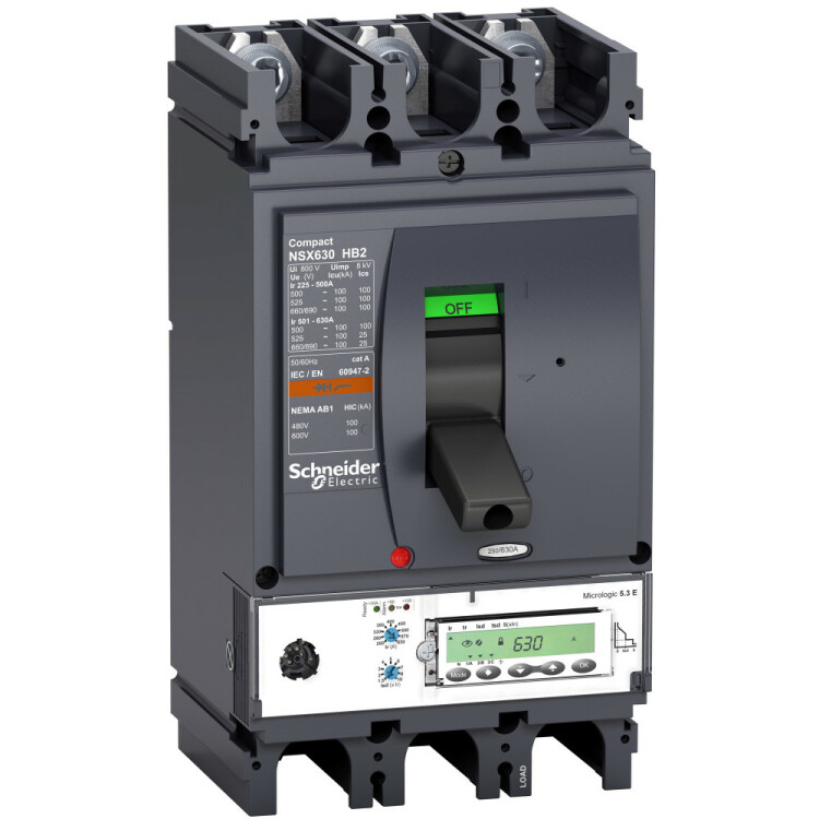 Автоматический выключатель Compact NSX630HB2 Schneider Electric, 3P3d - номинальный ток 630 А - Icu = 100 кА 690 В - Ics=100% Icu - с электронным расцепителем Micrologic 5.3 E (защита LSI, счетчик энергии) - ШхВхГ – 152x292x152 мм - исполнение – стационарный - монтаж - на DIN-рейке или плате. Преимущества: Прямой доступ к экономии затрат, безопасность и защита, контроль и измерение параметров электроэнергии, надежность энергоснабжения, простота и удобство. Применения: Применение в системах электроснабжения объектов любого масштаба – от крупнейших промышленных предприятий до офисных зданий для защиты распределительных сетей, генераторов, кабелей большой протяженности, электродвигателей.