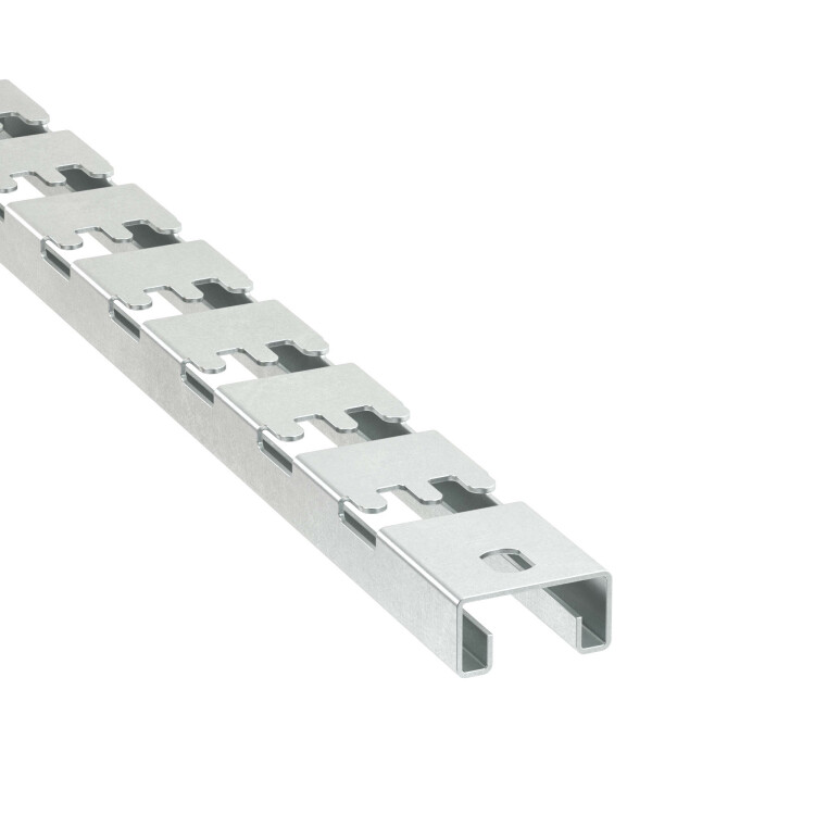 С-образный профиль серии FPL-21 предназначен для безвинтового крепления или подвеса проволочного лотка на шпильках. Применяется с проволочными лотками с шириной основания до 400 мм. Ширина профиля - 41 мм, высота - 21 мм, длина профиля - 480 мм, толщина стали - 1,5 мм. Отличительными особенностями консоли FPL-21 данного типоразмера являются отверстия 14х10,5 мм в двух крайних точках, а также отсутствие перфорации 14х10,5 мм между зубчатыми венцами. Профиль выполнен из оцинкованной стали устойчивой к коррозии.