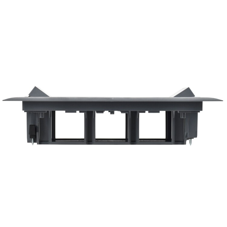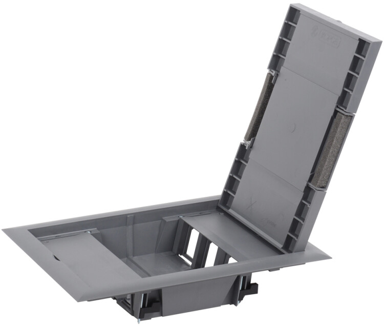 Лючок напольный ONFLOOR 12. Предназначен для организации рабочих мест в офисных или административных помещениях. В лючок можно установить 12 модулей (6 постов 45х45 мм / 12 модулей 45х22,5). Монтаж осуществляется в две рамки на 6 модулей каждая. Возможна установка лючка в фальшпол толщиной от 10 до 40 мм, необходимое монтажное отверстие для установки лючка 218х288 мм, либо в бетонный пол с обязательным использованием коробки напольной, в зависимости от толщины бетонного слоя: 57-75 мм: KNU-12-PA-9011; 80-95 мм: KNU-80-16-PA-9011 (рама лючка крепится на коробке напольной с помощью винтов диаметром 3,9x13 мм, которые поставляются в комплекте). Крышка лючка имеет небольшое углубление, усиленное стальным листом, для монтажа напольного покрытия с максимальной толщиной 7 мм (рекомендуемые напольные покрытия - ковер или ламинат). Крышка содержит 2 откидных вывода с мягким материалом, которые позволяют организовать вывод кабелей из лючка. Степень защиты IP30 - коробка не предназначена для влажной уборки. Конструкция лючков рассчитана на максимальную нагрузку 1500Н. Комплект поставки: Лючок напольный ONFLOOR 12 - 1 шт., рамка на 6 модулей для вертикальной установки - 2 шт., трафарет для финишного покрытия - 1 шт., комплект крепежа - 1 компл. Коробки для установки лючка в бетонный пол приобретаются отдельно. Цвет: тeмно-серый RAL 7012.