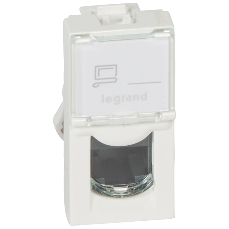 Информационная розетка для сетей передачи данных в офисах, учебных помещениях и жилых объектах. Используется для подключения компьютеров, телефонии и сетевого оборудования в составе структурированной кабельной системы. Одномодульный формат удобен для компактной установки в многопостовые рамки.