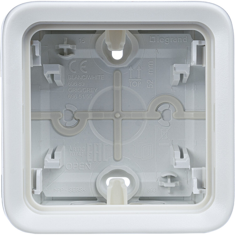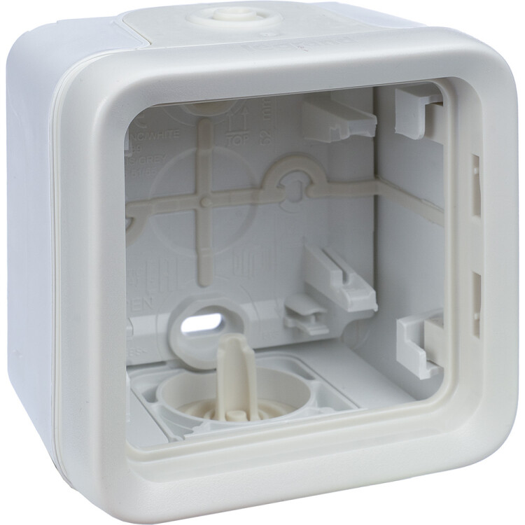 Накладная коробка серии Plexo с мембранными вводами для герметичного монтажа одного механизма. Применяется в помещениях с повышенной влажностью и на наружных участках, упрощая ввод кабеля без дополнительных аксессуаров.