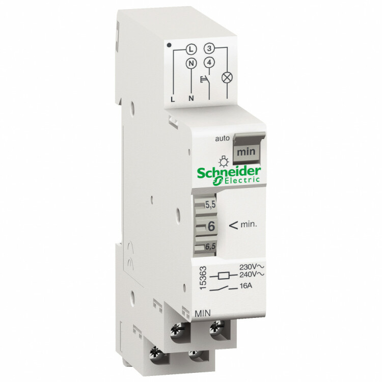 Реле с выдержкой времени MIN. диапазон: Acti 9 - краткое название устройства: MIN - тип устройства или его аксессуаров: электромеханический таймер. Преимущества: Света хватит!. Таймеры MIN обеспечивают как экономию, так и комфорт:, Их легко использовать путем нажатия кнопки управления., Их просто установить (механическая совместимость с электрической объединяющей шиной распределения).... применения: Благодаря возможности подключения к нескольким кнопкам управления они идеально подходят для управления освещением на лестничных клетках. Они также могут быть использованы для освещения коридоров в зданиях, в гаражах, для вентиляции в туалете и т. д....