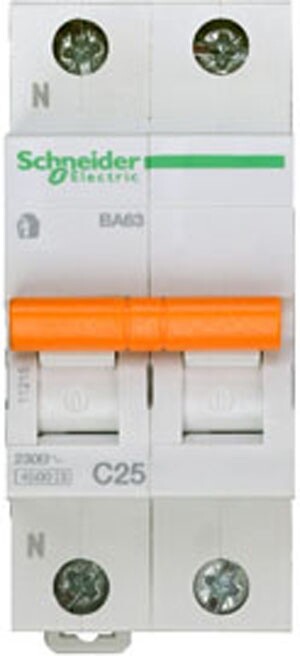 Автоматический выключатель ВА63 серии Домовой Schneider Electric, 1P + N, на номинальный ток 25А, характеристика С, с отключающей способностью 4500А, ширина 36 мм.