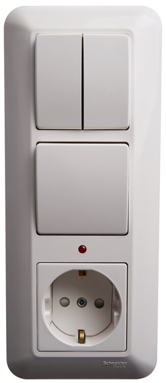 Блок комбинированный Schneider Electric ПРИМА (скрытой установки, белый) предназначен для сетей до 250 В, состоит из розетки на 16 А со шторками, одноклавишного выключателя с подстветкой и двухклавишного выключателя, оба на 6 А.