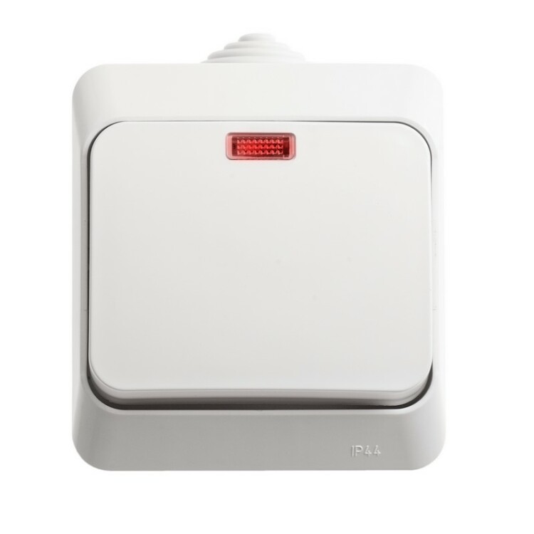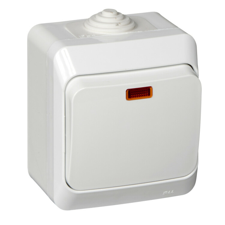 Выключатель Systeme Electric (ранее Schneider Electric) ЭТЮД (белый, открытой установки) одноклавишный, с подсветкой, предназначен для применения в сетях до 250В, на ток до 10А, что делает его легко находимым при отсутствии освещения. Он удобен в применении и отлично подходит для ванной комнаты (IP44). Сделано в России.