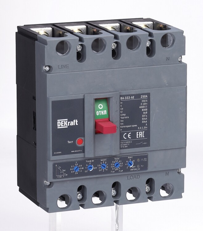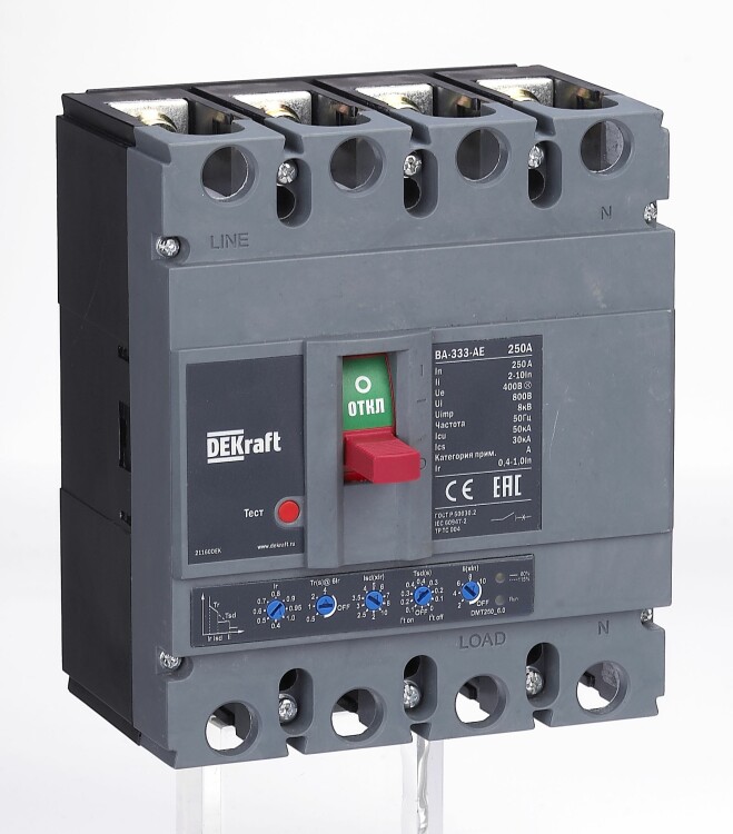 Автоматический выключатель серии ВА-333 АЕ DEKraft; 4P; номинальный ток 250 А, отключающая способность Icu = 50 кА (при 415 В 50 Гц); расцепитель and ndash; электронный; регулируемые уставки тока (Ir, Isd, Ii) и времени срабатывания (tr, tsd). В комплект поставки входят 4 межфазные перегородки и крепеж на монтажной плате. Электронный расцепитель с широким диапазоном регулирования уставок тока и времени позволяет применять выключатель для защиты разных нагрузок.