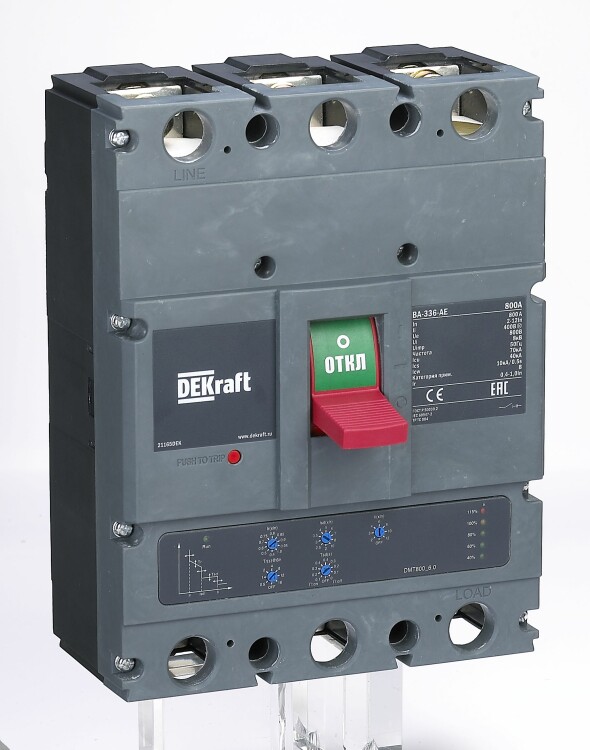 Автоматический выключатель серии ВА-336 АЕ DEKraft; 3P; номинальный ток 800 А, отключающая способность Icu = 70 кА (при 415 В 50 Гц); расцепитель and ndash; электронный; регулируемые уставки тока (Ir, Isd, Ii) и времени срабатывания (tr, tsd). В комплект поставки входят 4 межфазные перегородки и крепеж на монтажной плате. Электронный расцепитель с широким диапазоном регулирования уставок тока и времени позволяет применять выключатель для защиты разных нагрузок.