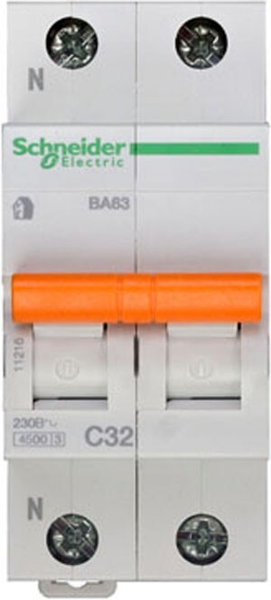 Автоматический выключатель ВА63 серии Домовой Schneider Electric, 1P + N, на номинальный ток 32А, характеристика С, с отключающей способностью 4500А, ширина 36 мм.