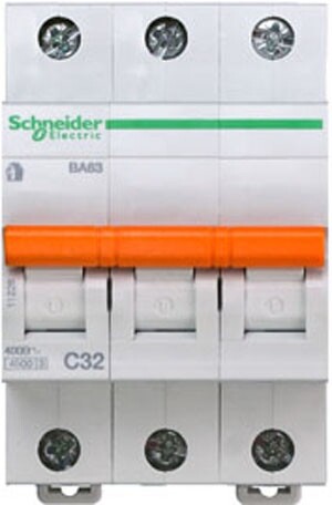 Автоматический выключатель ВА63 серии Домовой Schneider Electric, 3-полюсный, на номинальный ток 32А, характерист ика С, с отключающей способностью 4500А, ширина 36 мм.
