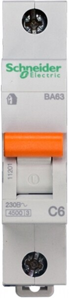 Автоматический выключатель ВА63 серии Домовой Schneider Electric, 1-полюсный на номинальный ток 6А, характеристика С, с отключающей способностью 4500А, ширина 18 мм.