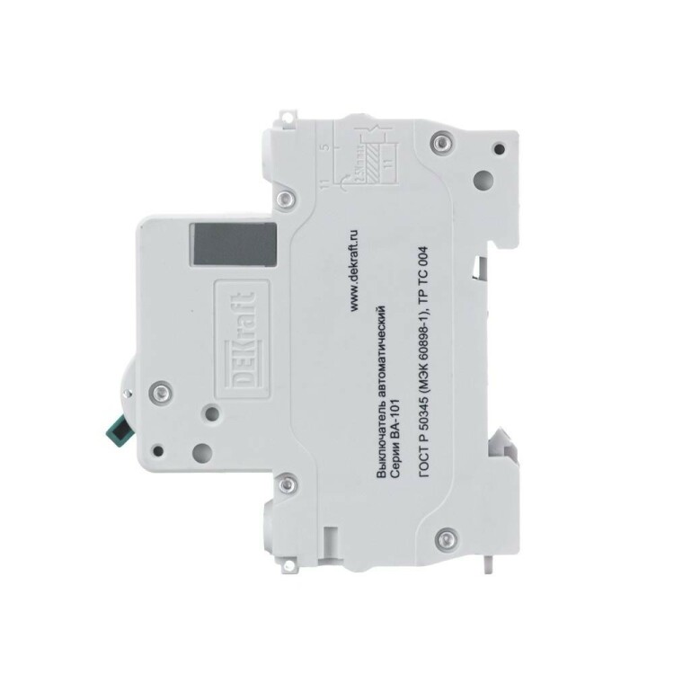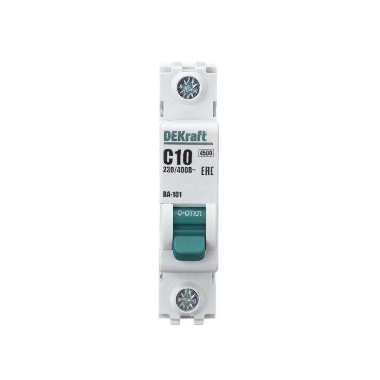 Автоматический выключатель серии ВА-101 Dekraft; 1P; номинальный ток 10 А; характеристика С; отключающая способность 4,5 кА. 5 монолитных заклепок повышают прочность корпуса аппарата. Сплошная лицевая панель обеспечивает безопасность эксплуатации аппарата. Боковые каналы охлаждения повышают стабильность работы при высоких температурах окружающей среды. Есть возможность установки доп олнительных аксессуаров с левой стороны устройства. Аппарат на 100% совместим с корпусами Dekraft и Systeme Electric.