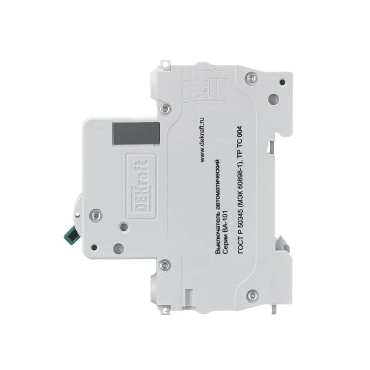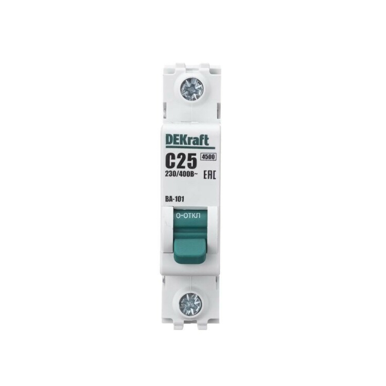 Автоматический выключатель серии ВА-101 Dekraft; 1P; номинальный ток 25 А; характеристика С; отключающая способность 4,5 кА. 5 монолитных заклепок повышают прочность корпуса аппарата. Сплошная лицевая панель обеспечивает безопасность эксплуатации аппарата. Боковые каналы охлаждения повышают стабильность работы при высоких температурах окружающей среды. Есть возможность установки доп олнительных аксессуаров с левой стороны устройства. Аппарат на 100% совместим с корпусами Dekraft и Systeme Electric.