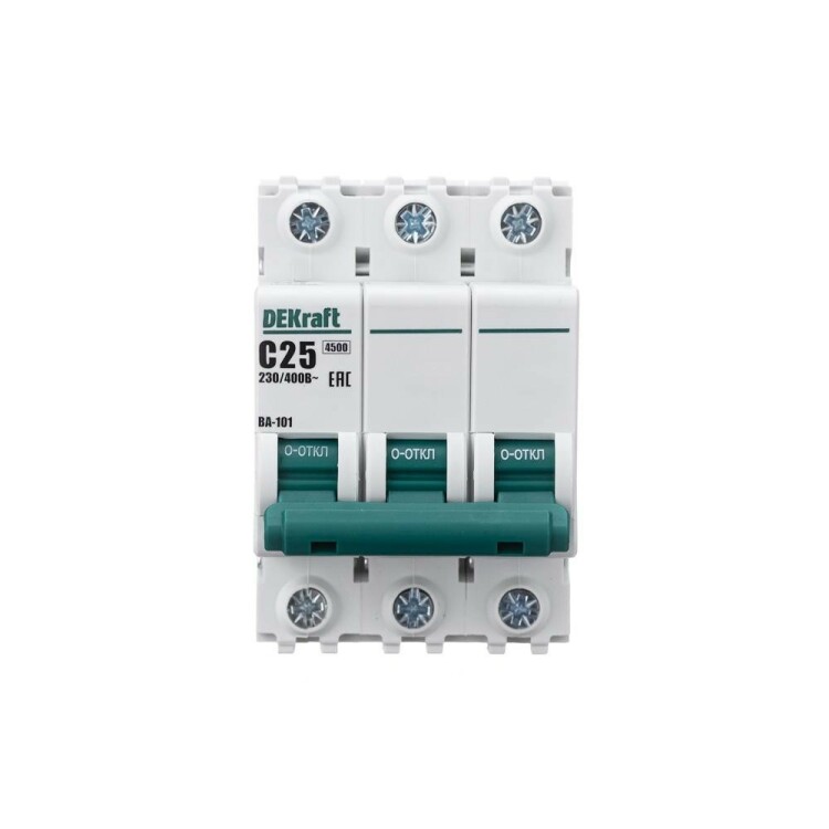 Автоматический выключатель серии ВА-101 Dekraft; 3P; номинальный ток 25 А; характеристика С; отключающая способность 4,5 кА. 5 монолитных заклепок повышают прочность корпуса аппарата. Сплошная лицевая панель обеспечивает безопасность эксплуатации аппарата. Боковые каналы охлаждения повышают стабильность работы при высоких температурах окружающей среды. Есть возможность установки доп олнительных аксессуаров с левой стороны устройства. Аппарат на 100% совместим с корпусами Dekraft и Systeme Electric.