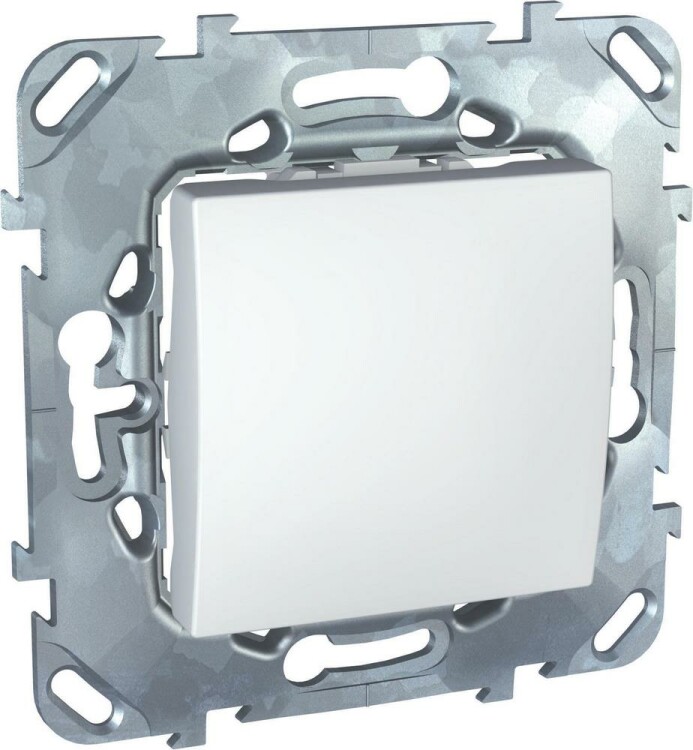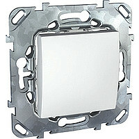 Переключатель одноклавишный Schneider Electric UNICA (белый) без подсветки предназначен для сетей до 250 В на ток до 10 А. - 1 переключающий контакт. - Специальные направляющие для облегчения ввода кабеля. - Переключатель позволяет управлять одним источником света из двух точек.