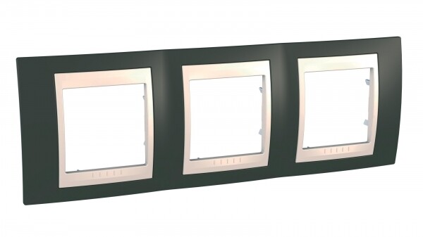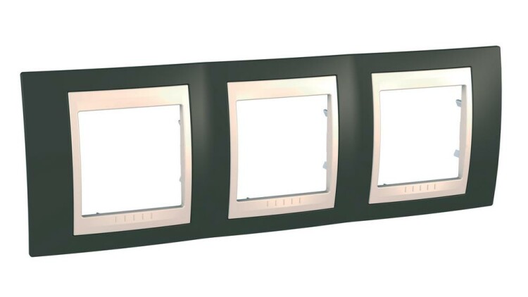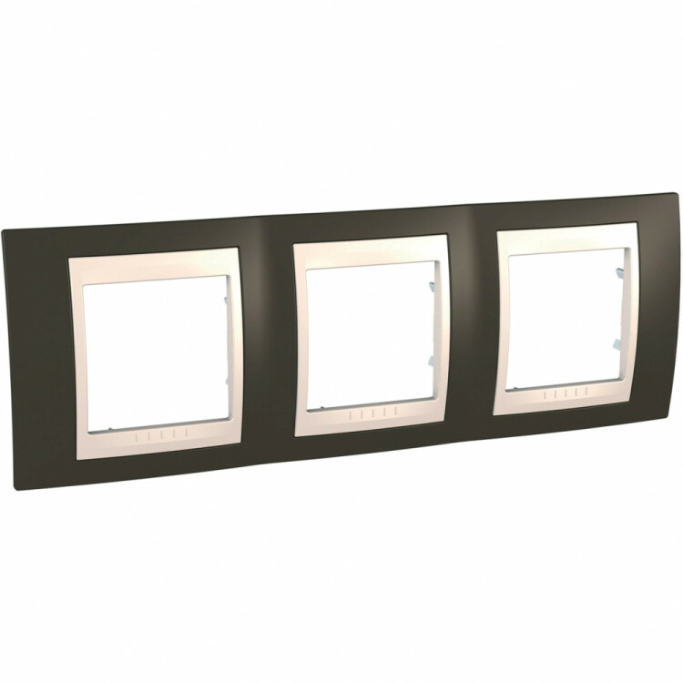 Рамка Schneider Electric UNICA ХАМЕЛЕОН (какао) трёхместная с бежевой декоративной вставкой.
