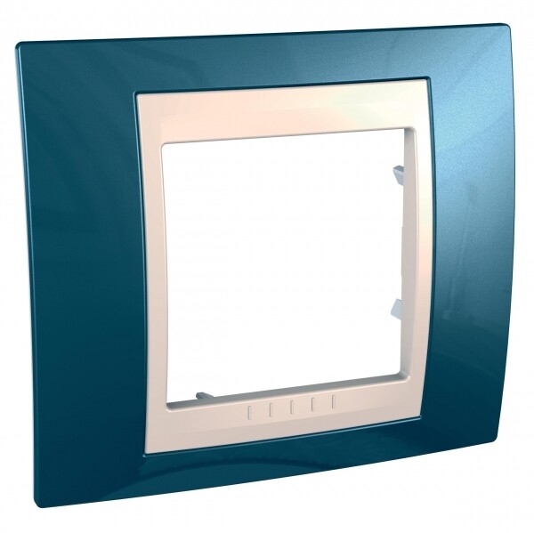 Рамка Schneider Electric UNICA ХАМЕЛЕОН (голубой лёд) одинарная с бежевой декоративной вставкой.