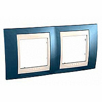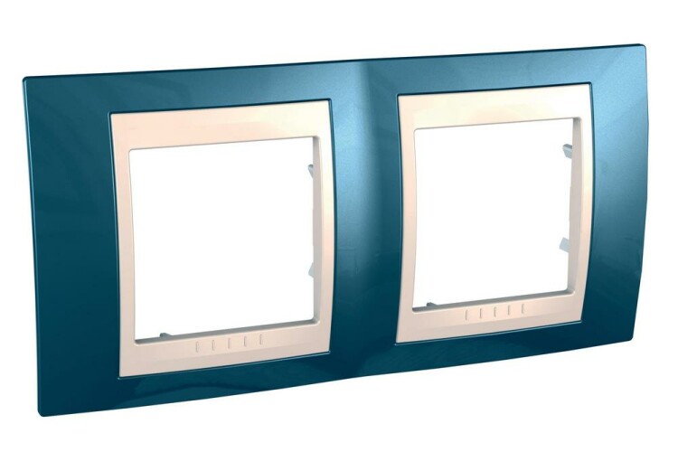 Рамка Schneider Electric UNICA ХАМЕЛЕОН (голубой лёд) двухместная с бежевой декоративной вставкой.