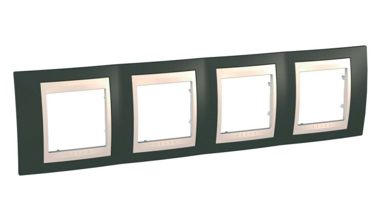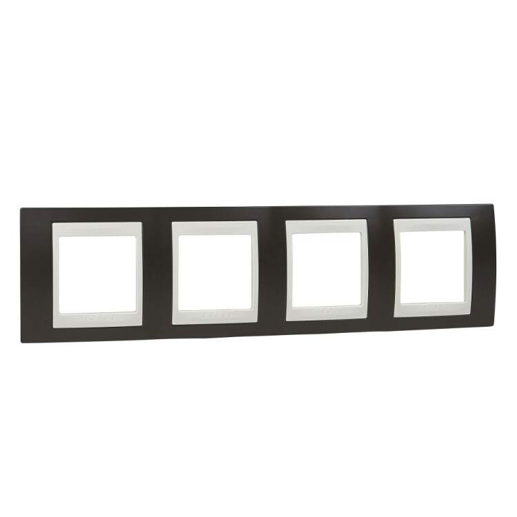 Рамка Schneider Electric UNICA ХАМЕЛЕОН (какао) четырёхместная с бежевой декоративной вставкой.