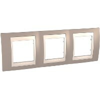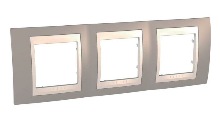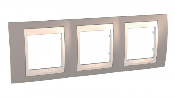 Рамка Schneider Electric UNICA ХАМЕЛЕОН (коричневый) трёхместная с бежевой декоративной вставкой.