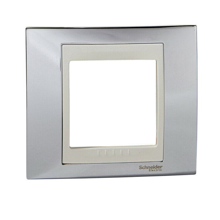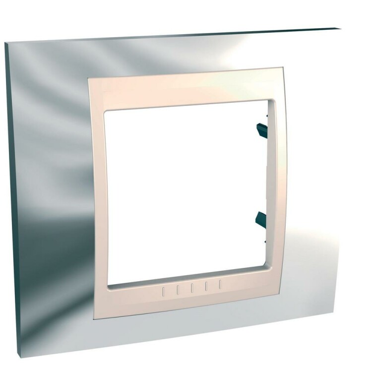 Рамка Schneider Electric UNICA ХАМЕЛЕОН (серебро) одинарная с бежевой декоративной вставкой.