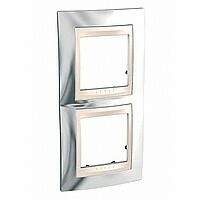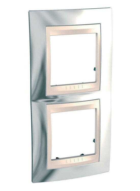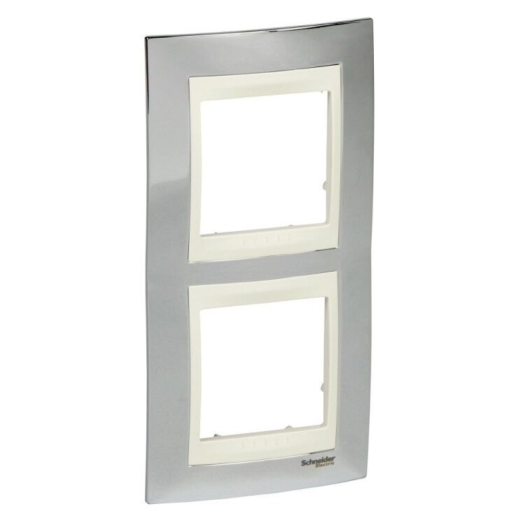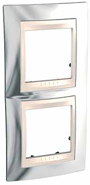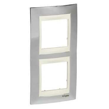 Рамка Schneider Electric UNICA ХАМЕЛЕОН (серебро) двухместная с бежевой декоративной вставкой.