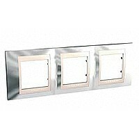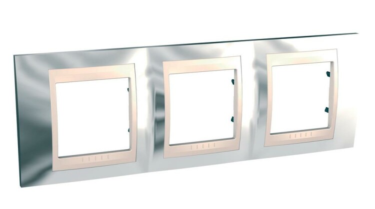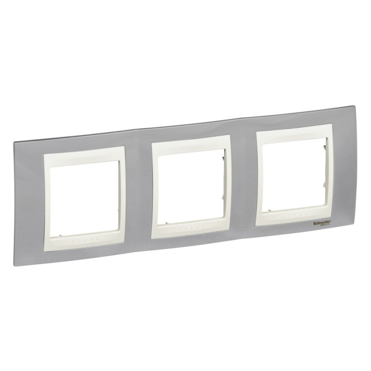 Рамка Schneider Electric UNICA ХАМЕЛЕОН (серебро) трёхместная с бежевой декоративной вставкой.