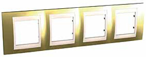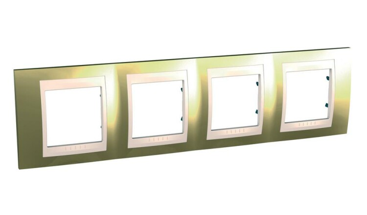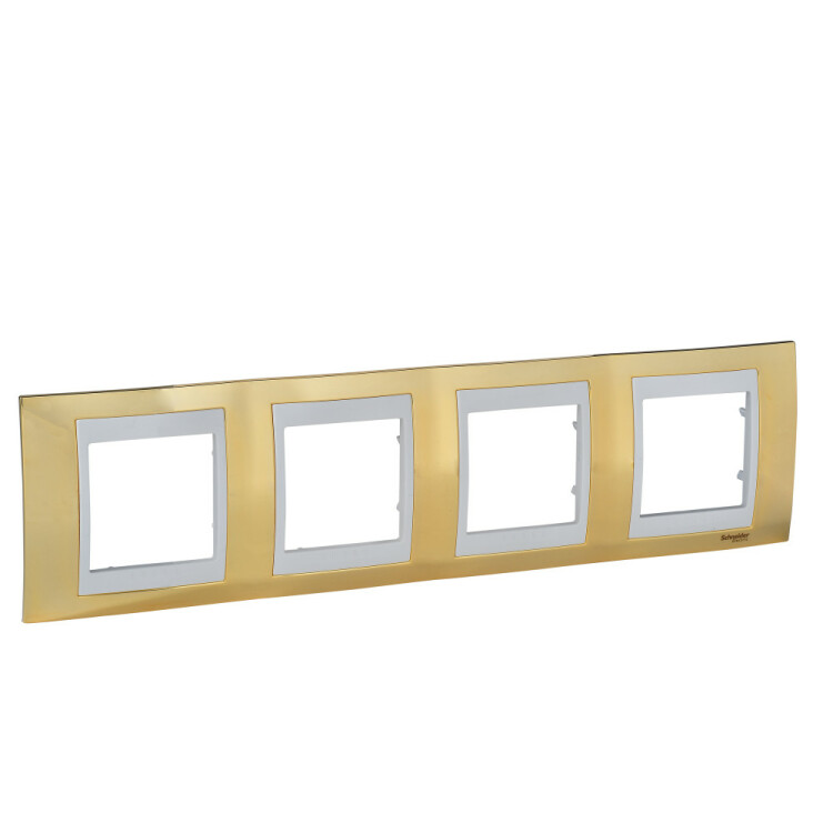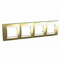 Рамка Schneider Electric UNICA ХАМЕЛЕОН (золото) четырёхместная с бежевой декоративной вставкой.