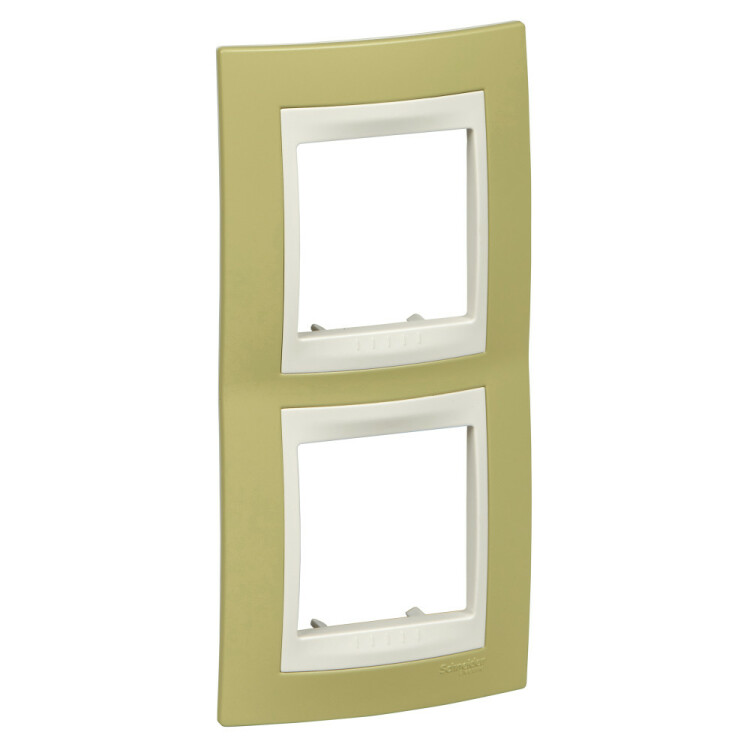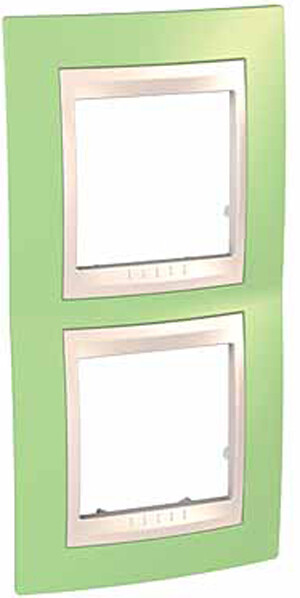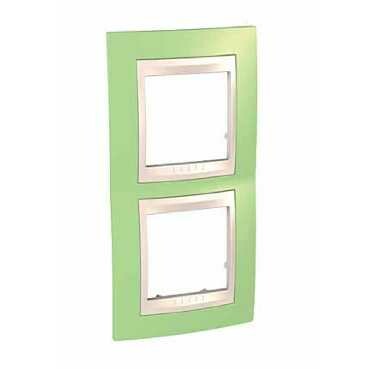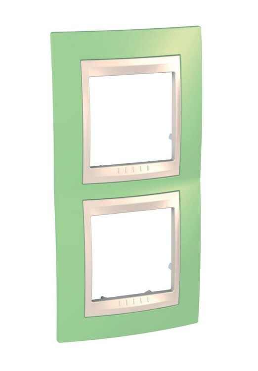 Рамка Schneider Electric UNICA ХАМЕЛЕОН (зелёное яблоко) двухместная с бежевой декоративной вставкой.