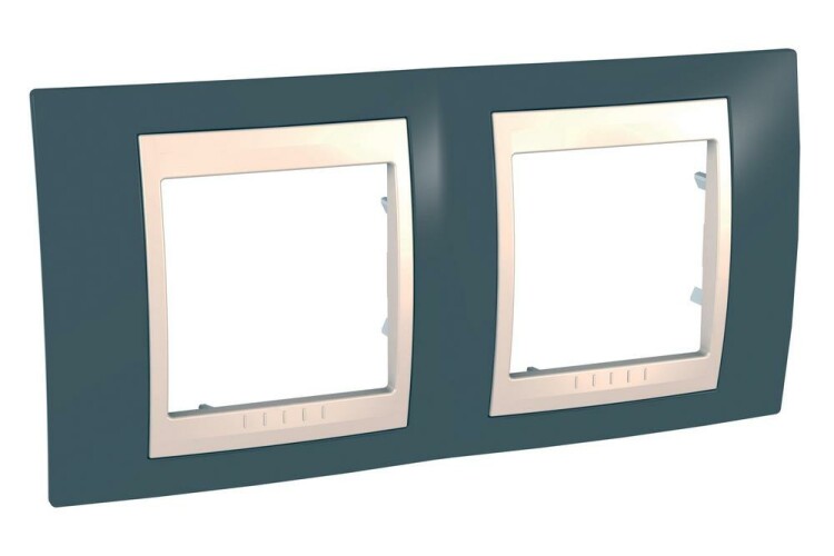 Рамка Schneider Electric UNICA ХАМЕЛЕОН (серо-зелёный) двухместная с бежевой декоративной вставкой.
