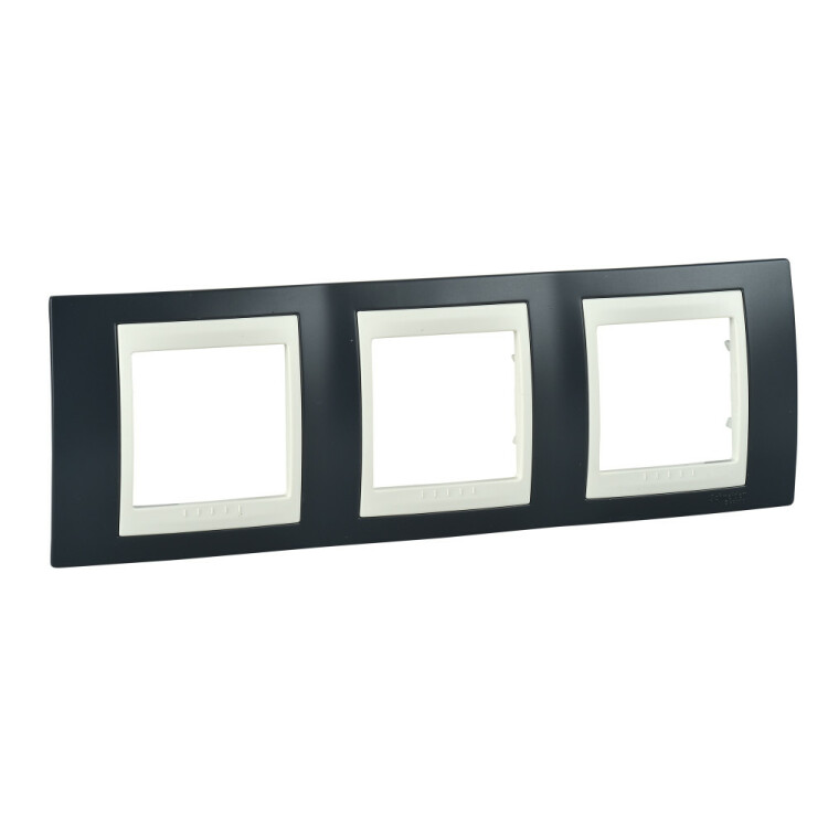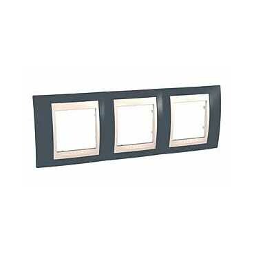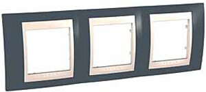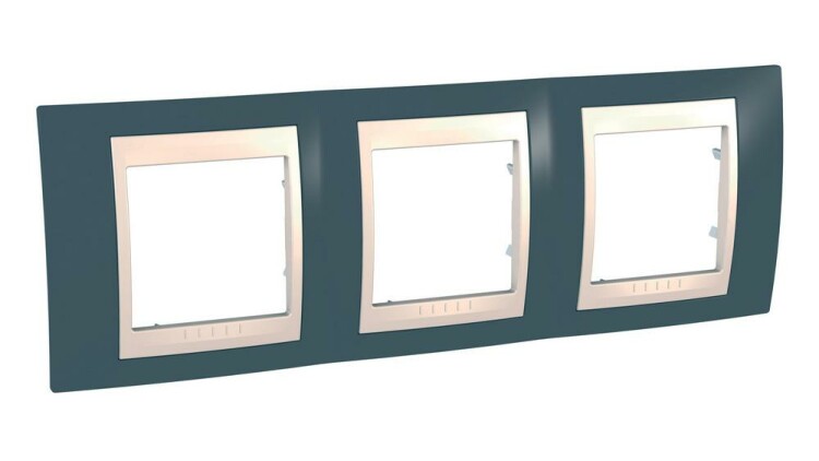 Рамка Schneider Electric UNICA ХАМЕЛЕОН (серо-зелёный) трёхместная с бежевой декоративной вставкой.