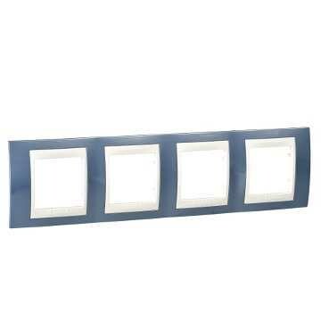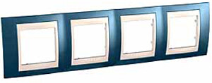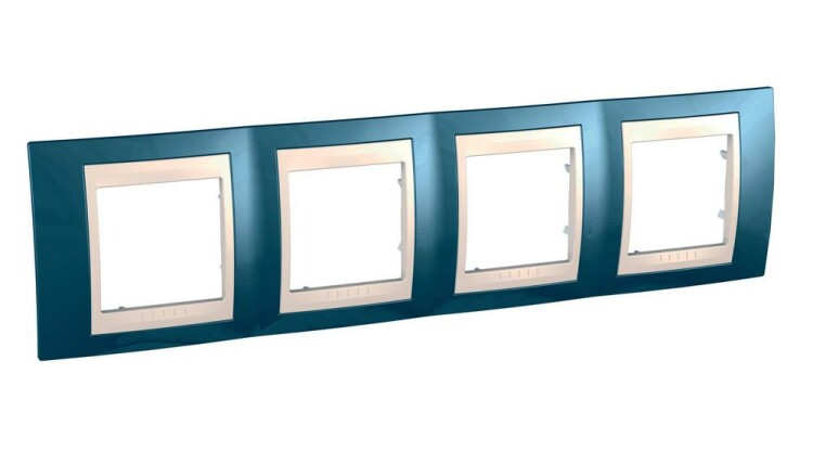 Рамка Schneider Electric UNICA ХАМЕЛЕОН (голубой лёд) четырёхместная с бежевой декоративной вставкой.