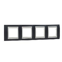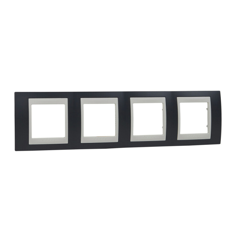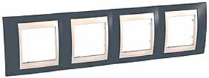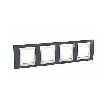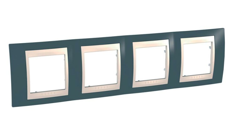 Рамка Schneider Electric UNICA ХАМЕЛЕОН (серо-зелёный) четырёхместная с бежевой декоративной вставкой.